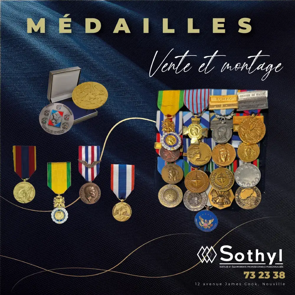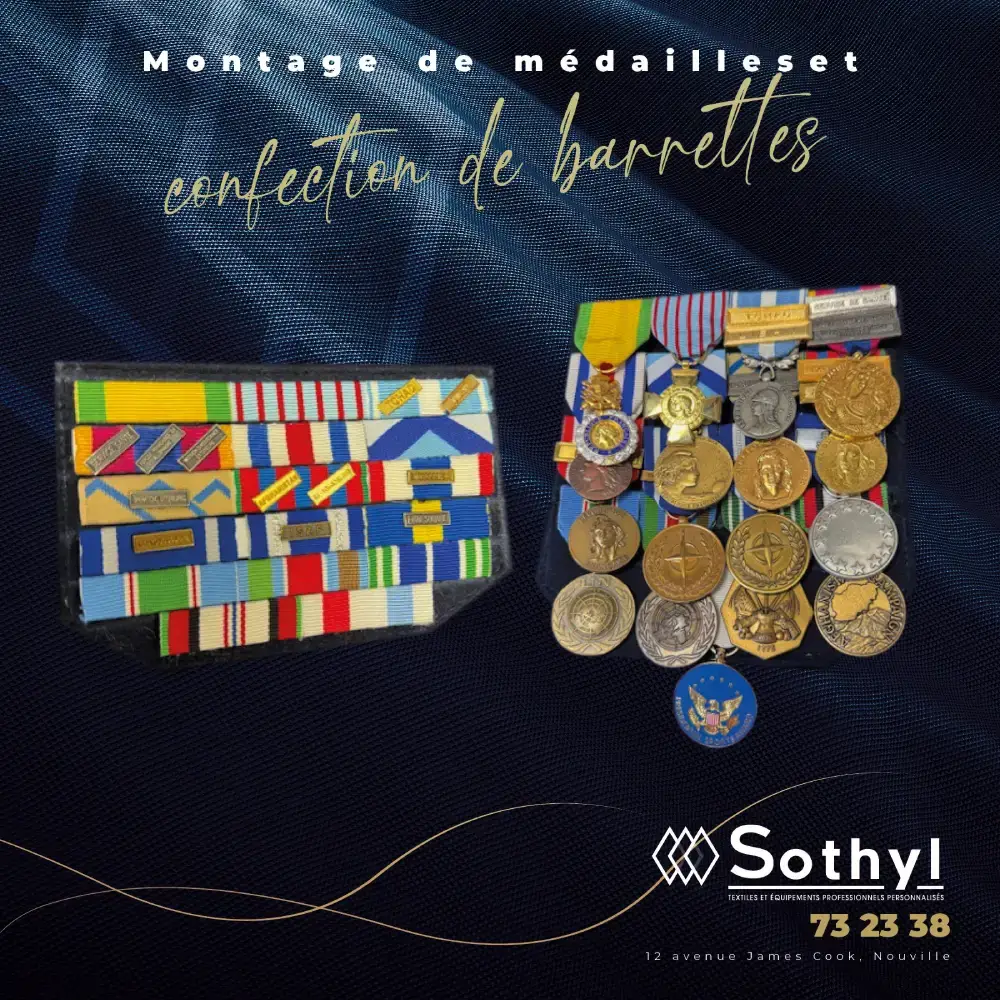 Sothyl propose une gamme complète de vêtements professionnels personnalisés. Notre offre inclut chemises, pantalons, tabliers, képis, casquettes, chaussures et autres articles alliant confort et conformité réglementaire. En complément, nous fournissons des médailles militaires, parfaites pour valoriser les services rendus.